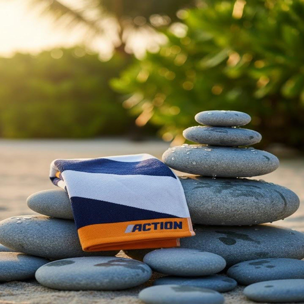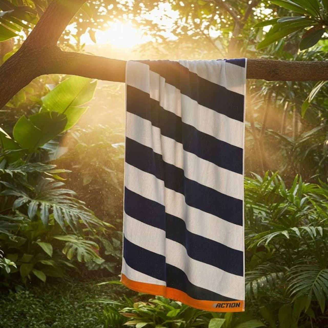 Elevate your outdoor experience with the Action Nautical Stripe beach towel, designed for those who demand both style and high-performance functionality. Featuring a bold, diagonal navy and white stripe pattern framed by energetic orange borders, this towel delivers a modern, athletic look that stands out on any shoreline.